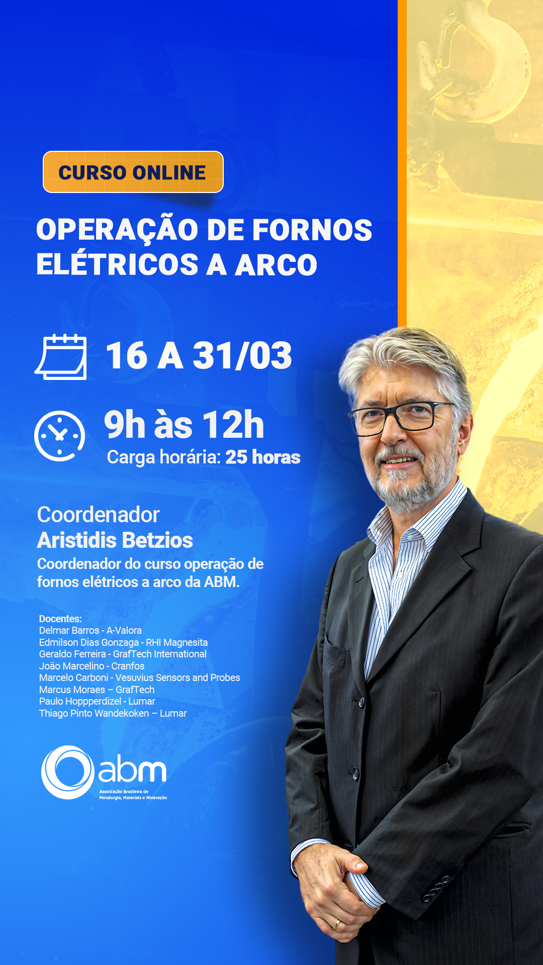 Este curso tem como objetivo fornecer os conhecimentos básicos sobre os Eletrodos de Grafite e suas características únicas, focando nos aspectos práticos para a sua correta utilização nos Fornos Elétricos a Arco, trazendo também problemas e soluções para os casos mais comuns que ocorrem em aciarias no mundo.
